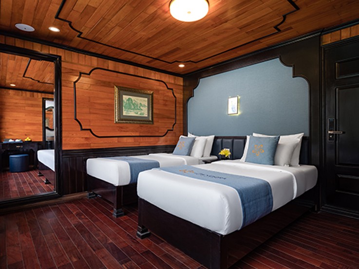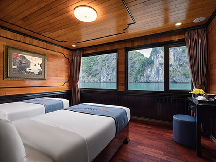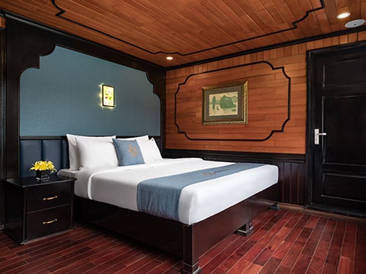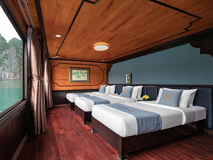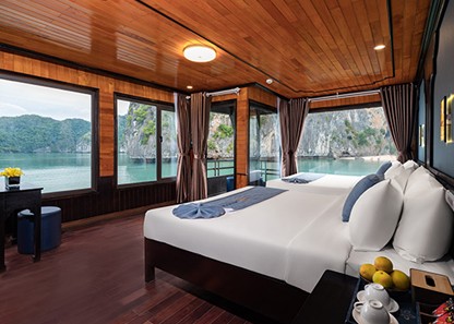 The room choice has 2 options for the capacity of two guests - one double bed or two single beds. Ocean View Double/Twin Suite offers an amazing overview of the landscape of Lan Ha Bay. This suite is fully equipped with many necessities, ranging from emergency equipment like a safety box, life jackets, a waterproof torch, and a hammer, to kitchenwares and a luxurious en-suite standing bathroom.