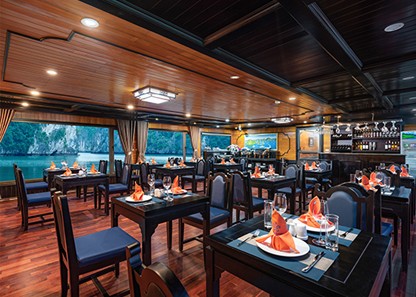 Each cabin is donned in an elegant design that takes inspiration from Oriental design, keeping it minimalist but not too bland. A large panoramic window is also the money piece of the cabins, from which you can fully take in the view of a charming Lan Ha Bay with mesmerizing nature and blue water. These suites are not only aesthetically pleasing but also prioritize the safety of every guest, all 12 cabins are equipped with up-to-date equipment and devices, allowing you to enjoy your time on board to the fullest.